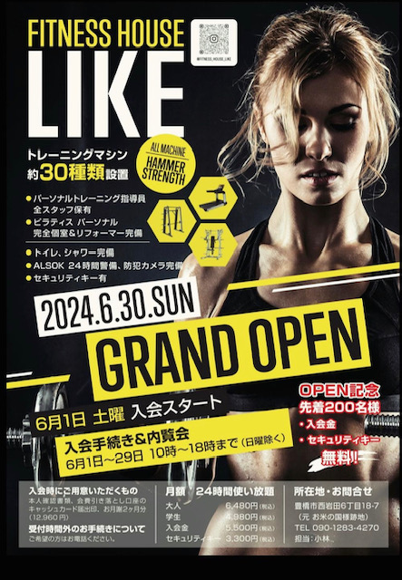豊橋市西岩田(元 お米の国様跡地)にて『FITNESS house LIKE(フィットネスハウスライク)』が2024年6月30日(日)グランドオープン!!